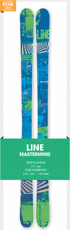 Wie uns der „Mastermind“ über all die Jahre durch die Test-Lappen schlüpfen konnte, bleibt wohl für immer ein Rätsel. Vielleicht weil sich der Line als günstige Alterna- tive eher an die Freestyle-Einsteiger richtet. Günstig muss ja bekanntlich nicht schlecht sein – und so erfüllt der Twintip seine Anforderung mit Bravour. Als leichtester Ski in der Freestyle-Range der Amerikaner überzeugte der „Mastermind“ mit seinem einfachen Handling und sei- ner Vielseitigkeit. Im Park gehören Jibs und Rails zu seinen Stärken. Auch auf Kickern ließ sich der Line wegen seines geringen Gewichts problemlos spinnen. Wer also einen Ski sucht, mit dem man seine ers- ten und anschließend noch weitere Schritte im Freestyle unternehmen will, der ist mit dem „Mastermind“ bestens beraten.