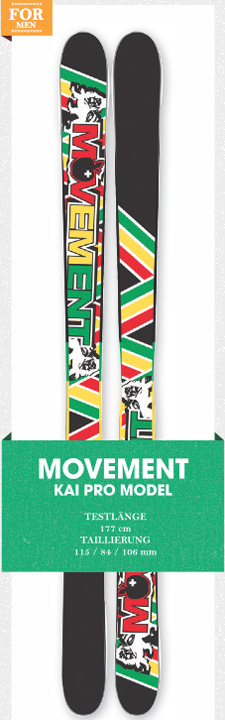 Mit einem lachenden und einem weinenden Auge haben wir hier den Bericht für den „Kai Pro“ geschrie- ben. Schließlich hatten alle Test- Rider ein Stück Freeski-Geschichte am Fuß. Der Twintip war nämlich Kai Mahlers erstes und zugleich letztes Pro Model auf Movement, da das Schweizer Ausnahmetalent jüngst zu Apo wechselte. Schade eigentlich für ihn, denn die Eidgenossen haben ihm da einen Ski gezaubert, der per- fekt auf sein Riding zugeschnitten wurde. Der Ski ist daher eher straff konstruiert, was ihn zur absoluten Kicker-Waffe werden lässt. Kein In- run ist ihm zu schnell und keine Lan- dung zu steil. Und hat man die Flex- Zonen erst einmal ausgemacht, poppen die Rasta-Bretter sogar easy auf jedes Jib Obstacle. Durch seine schmale Taille macht der „Kai Pro“ auf dem Metall eine top Figur!
