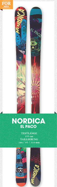 Der „El Paco“ ist neu in der Freeski- Range der Italiener und führt mit 87 Millimetern Taille das Männer- Quartett der Park-Latten an. Wie seine Kollegen besitzt auch der Neuling sanfte Rocker an Tip und Tail, die den Ski sehr agil machen. Mit der etwas breiteren Hüfte ist der „El Paco“ spürbar allround-taugli- cher als seine Brüder und fährt ag- gressiv wie ein Slalom-Ski. Genau diese Eigenschaft lässt den Nordica bei schnellen Kicker-Inruns etwas unruhig werden. Positiv dagegen wirkt sich sein Shape und Flex auf Rails aus, da sich der Ski durch seine Drehfreudigkeit leicht auf dem Me- tall parken lässt. Ob man vier Park- Modelle benötigt, die sich gerade mal um drei Millimeter Taillenbreite unterscheiden, bleibt dahingestellt. Sicher ist aber, dass der Nordica ein wirklich guter Freestyler ist.