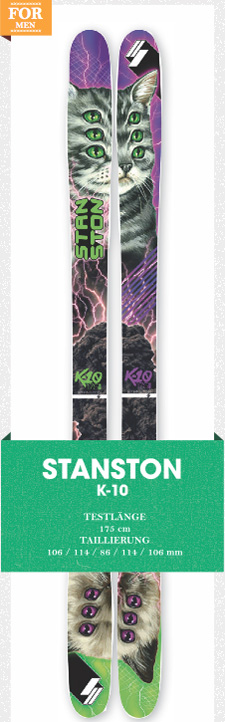 Oha, jetzt wird’s exotisch. „Stanton“ kennt man ja, aber Stanston? Hat sich da einer verschrieben? Nein! Stanston ist eine kleine, aber fei- ne Ski-Schmiede, deren Ursprün- ge in Quebec liegen. Exotisch sind jedenfalls auch die Graphics der noch jungen Brand. Von welchem Park-Ski blickten einem sonst noch sechs Paar Katzenaugen entgegen? Bei der Konstruktion vertrauen die Ingenieure von Stanston auf das Zusammenspiel von Tip&Tail Ro- ckern sowie Traditional Camber und Tapern. Ergebnis dieser Kombina- tion ist ein verspielter Twintip mit ordentlich Pop – genau das Richtige für slushige Testtage! Der „K-10“ verführte sogar beinharte Freerider zum Jibben. Einigen Fahrern war al- lerdings die Nose etwas zu weich, was sich bei Switch-Landungen be- merkbar machte.