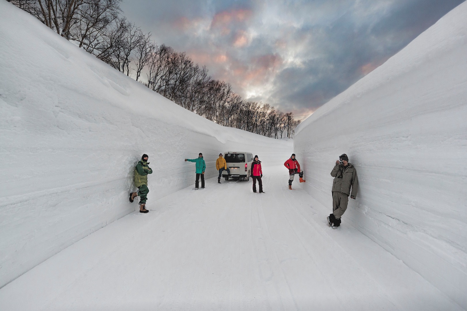 Info: Der Grund für die enormen Schneemengen in Japan und besonders auf der nördlichsten Insel Hokkaido ist die Nähe zu Sibirien und zum Meer. Die kalten Winde, die von Sibirien über das Japanische Meer kommen, nehmen extrem viel Feuchtigkeit auf und schneien diese auf der Westseite der Berge ab. Da das Meer nicht zufriert wird konstant Feuchtigkeit aufgenommen und es schneit fast ununterbrochen. Durch die anhaltende Kälte, -10 bis -20 °C in den Wintermonaten bleibt der Schnee sehr kalt und trocken. Schichtenbildung wird dadurch verringert und die Lawinengefahr sinkt. Der Schnee ist so leicht und fluffig, dass man beim Durchfahren kaum gebremst wird und einem der Schnee immer bis über den Kopf fliegt. Jährlich fallen dort 20 bis 25 Meter Schnee und es türmen sich riesige Schneewände auf.