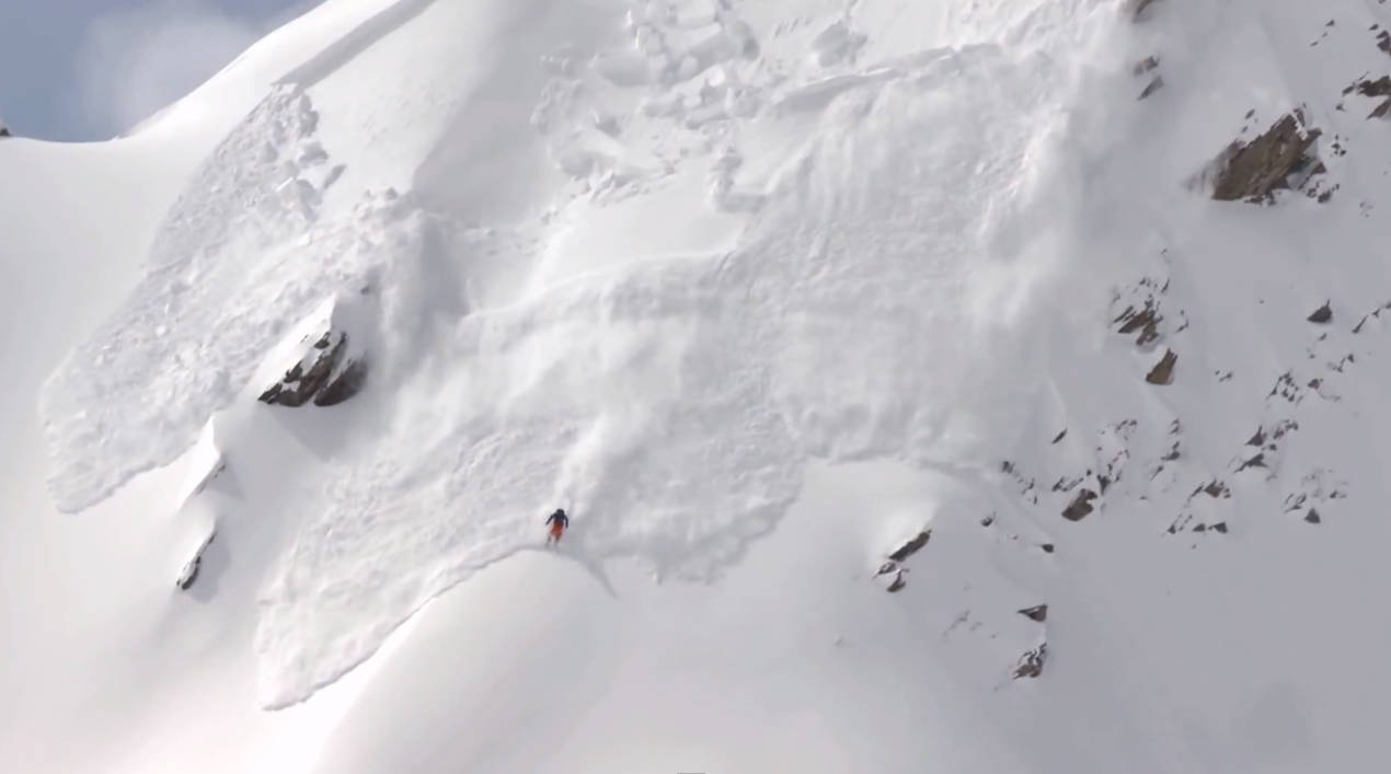 Da hat Julien Lopez so einen guten Fluchtversuch angesetzt als er merkt, dass gleich bei seinem Dropin in diesen Hang ein beachtliches Schneebrett abgeht. Gerade...