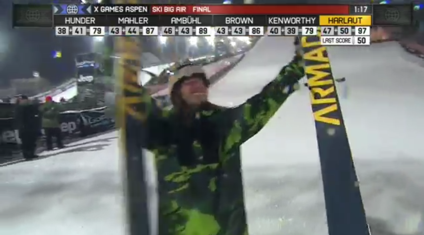 http://www.youtube.com/watch?v=qhEYOxzWO5w Da zieht der so ein Ding ab! Henrik Harlaut holt sich mit einem perfekten Score Gold beim XGames Big Air in Aspen.
