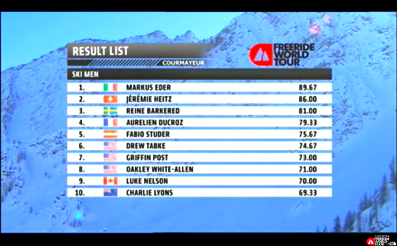 Markus Eder siegt beim Freeride World Tour Stop in Courmayeur Mont Blanc. Der Schweizer Jérémie Heitz wird zweiter und Reine Barkered landet auf dem dritten....