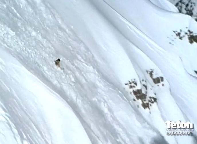 Oldschool Aufnahme einer Rutschpartie über ein ordentliches Cliff inklusive Lawine. Da hätten dem Guy Fat-Skis damals auch nichts genutzt. Zum Glück lief das Schneebrett gut...