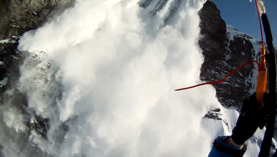 Da hat Julien Lopez so einen guten Fluchtversuch angesetzt als er merkt, dass gleich bei seinem Dropin in diesen Hang ein beachtliches Schneebrett abgeht. Gerade...