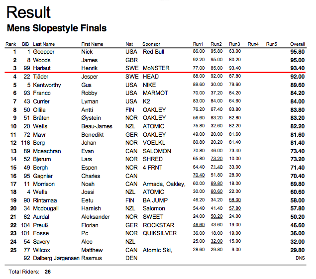 Hier könnt ihr euch den kompletten Stream des Men´s Slopestyle Finales ansehen. USA beansprucht das ganze Podium! //