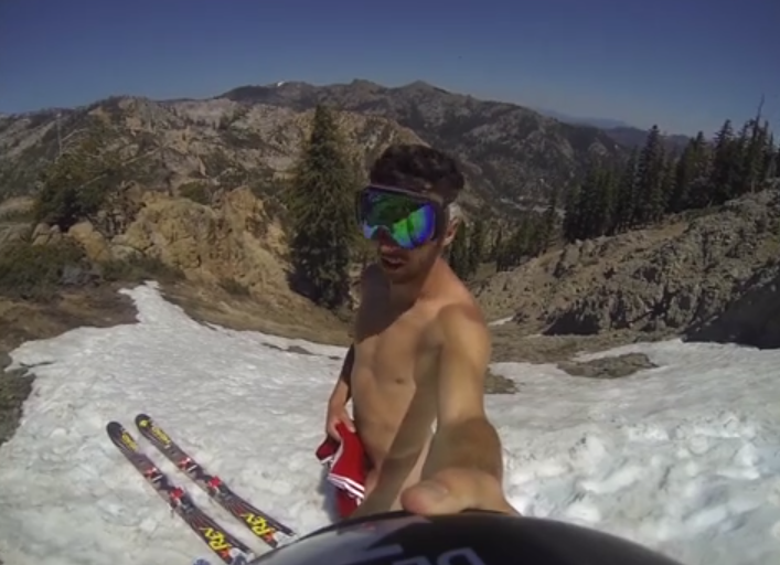 Er macht es vor was bei so einem Herrlichem Frühlingstag zu tun ist: Naked Skiing!
