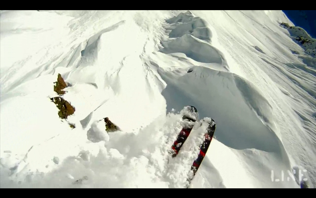 Aiaiaiiii! Da hat er aber Schwein gehabt, der Eric Pollard. Schleicht sich doch frecherweise von hinten ein Schneebrett an, während er bei Nimbus Dreharbeiten über ein Pillowfeld bügelt. Glücklicherweise wurde er unten wieder ausgespült, aber der Schreck saß sicher in den Knochen.
