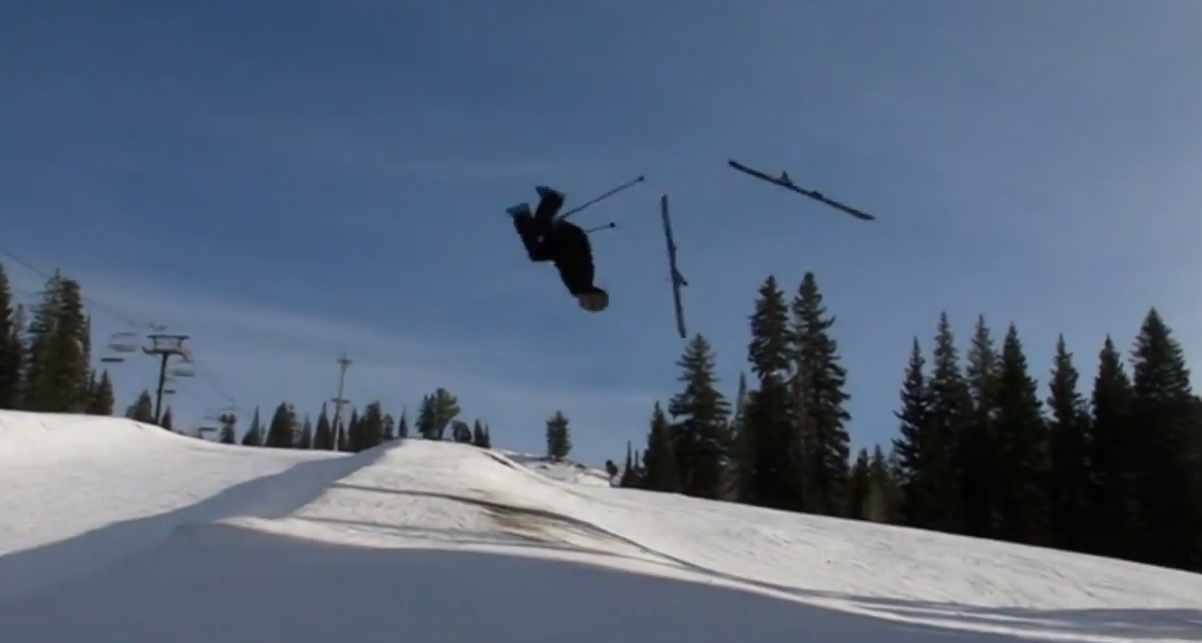 Ein sehr interessanter Crash aus Level 1’s “Partly Cloudy” von Gangster-Skier Ahmet Dadali. Irgendwie verkantet er blöderweise auf dem Rail und hechtet in die Landung, die wie so oft bei urban Obstacles eher flach ausfällt. Aber der Junge scheint hart einstecken zu können und lächelt danach noch.