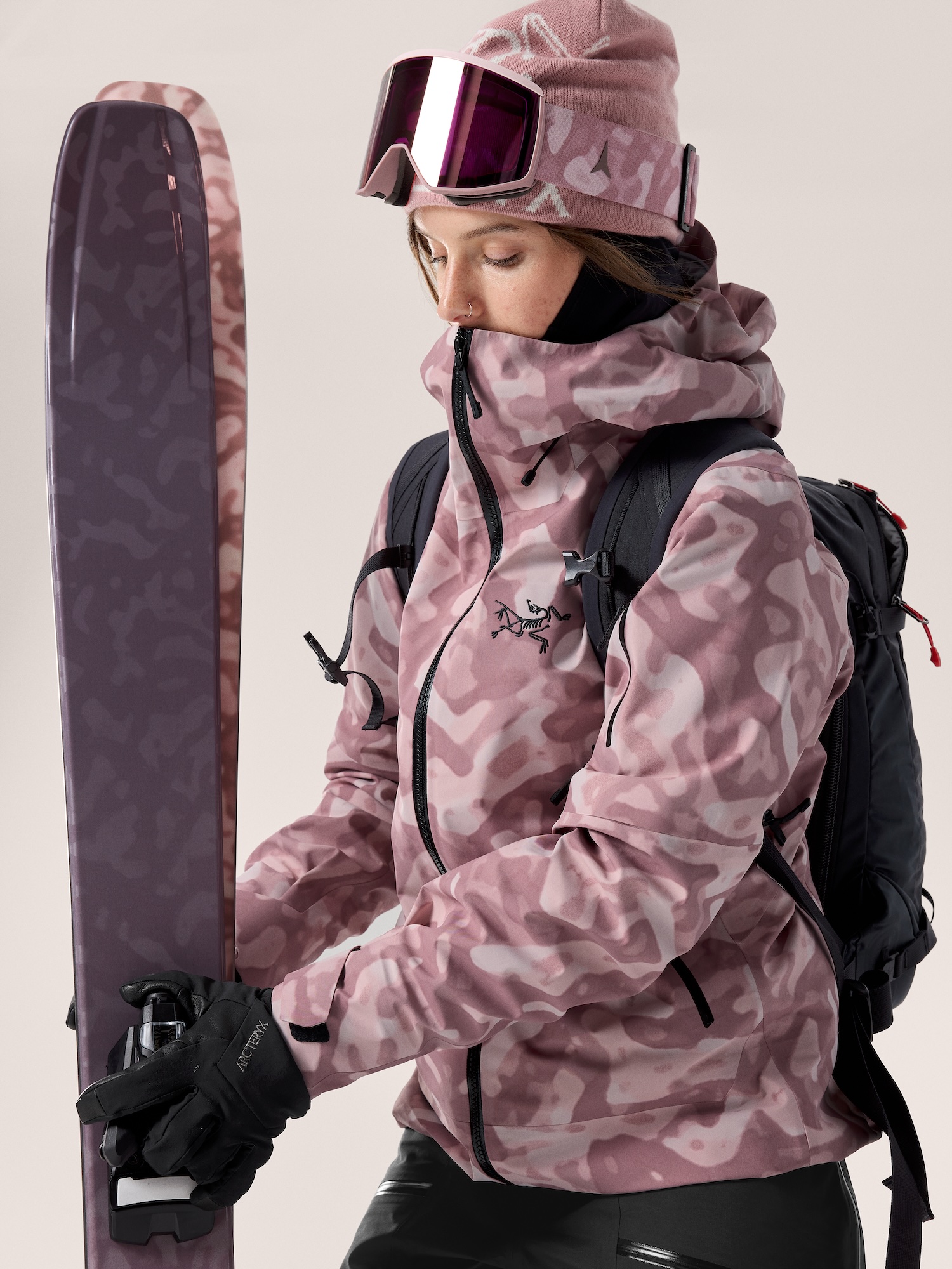 Mit der Sentinel Jacket Print Women bringt Arc’teryx eine technisch kompromisslose Freeride-Shell für Skifahrerinnen, die bei wechselnden Bedingungen und langen Tagen im Gelände unterwegs sind. Auffällig ist dabei nicht nur die Performance, sondern auch das Design: Die Grottoflage-Printoptik interpretiert Tarnmuster neu und orientiert sich an natürlichen Strukturen alpiner Landschaften. Der Look wirkt modern, hochwertig und fügt sich gleichzeitig harmonisch in winterliche Umgebungen ein.